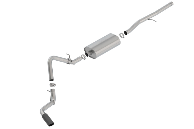 Factory Single Side Exit vehicles ONLY. Add Adapter 60708 for Crew Cab with Standard Bed (6' 7") 157" Wheelbase vehicles. The 3" diameter Borla(r) Cat-Back(tm) system is a side exit system featuring the mellow Touring sound level with no drone inside the vehicle, and a 4" round black chrome on T-304 stainless steel tip. A system with a bright chrome on T-304 stainless steel tip is also available. Using Borla(r) Stainless Steel Polish p# 21461 is NOT recommended with these black chrome tips. We suggest cleaning the tips with hot water and a microfiber cloth. Add Adapter 60706 For Crew Cab with Standard Bed (6' 7") 157" Wheelbase vehicles. Borla(r) Cat-Back(tm) and Axle-Back exhaust systems feature patented straight-through and multi-core technology designed to unleash hidden horsepower. Increased exhaust velocity adds power, driving excitement, fuel economy, and the distinctive Borla(r) Sound of Power respected by motoring enthusiasts everywhere. Each system is built from premium, high-quality T-304 austenitic stainless steel, superior to T-400 to give you the absolute best in performance and durability. Ultra-smooth mandrel bends ensure maximum flow & power, and precision CNC manufacturing ensures an accurate fit. Give your Silverado or Sierra the power and sound it deserves, bolt on a Borla(r). You can count on Borla(r) to provide durability, performance, sound, and a Million-Mile Warranty. See separate note about warranty on tip finish.