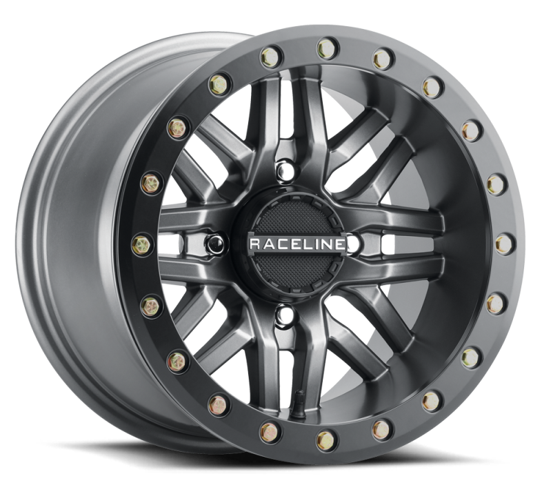 Raceline A91G Ryno 15x7in/4x156 BP/10mm Offset/132.5mm Bore - Gunmetal & Black Ring Beadlock Wheel