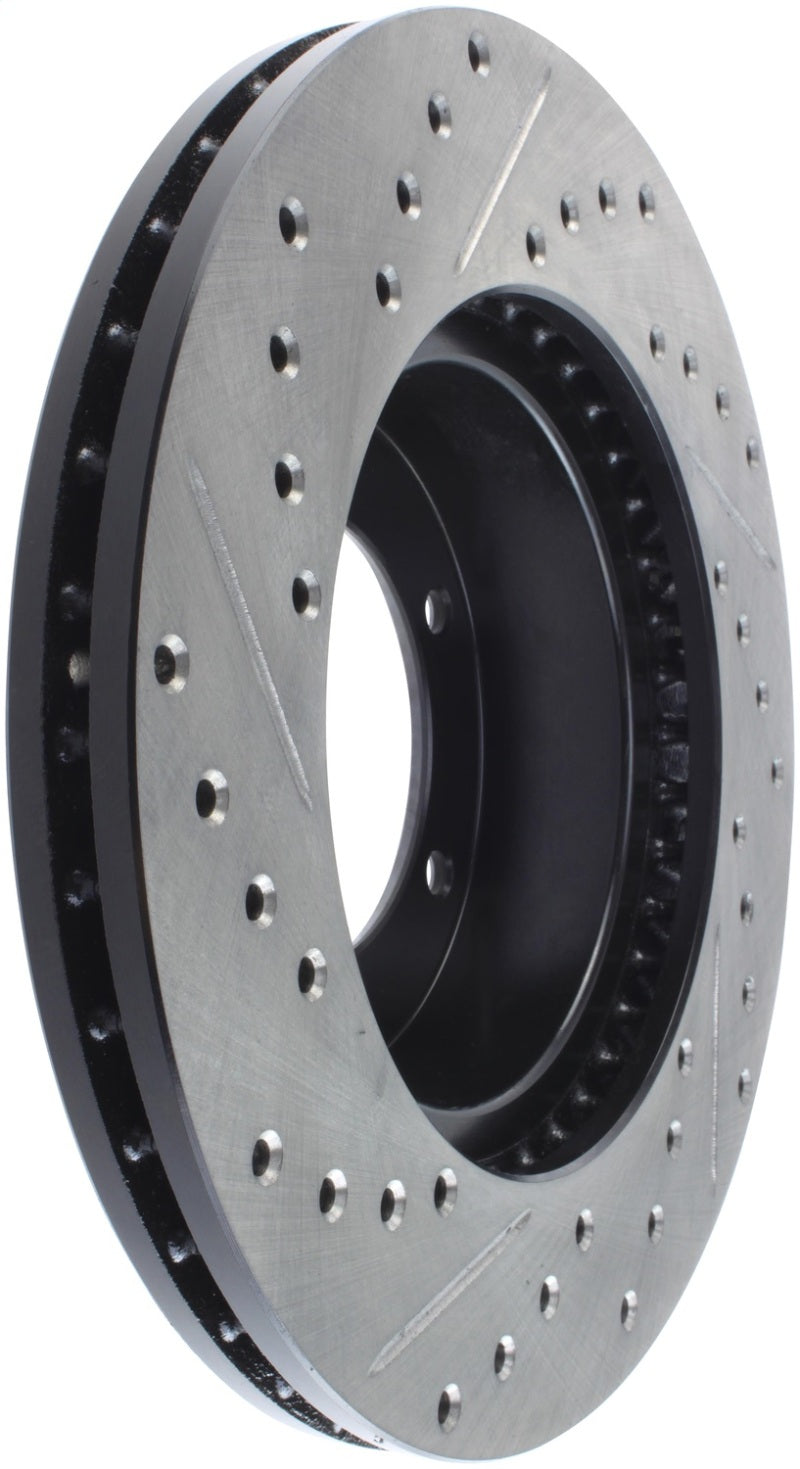 StopTech Drilled and Slotted Sport Rotors are 1-piece direct replacement brake discs for factory brake systems and stock calipers that look great behind your wheels – and offer significantly improved braking performance. The unique cross-drilling and slotting aids with heat and brake dust dispersal, prevents glazing of the pads, adds bite and improves wet and dry braking performance. Built to last, the black e-coating provides protection from corrosion and the high carbon metallurgy (in most applications) offers quieter operation, better crack resistance and increased performance.