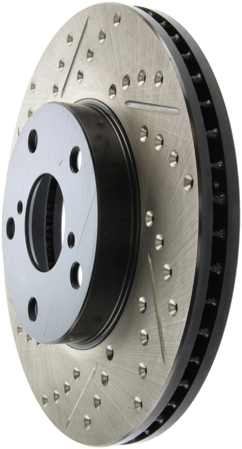 StopTech Drilled and Slotted Sport Rotors are 1-piece direct replacement brake discs for factory brake systems and stock calipers that look great behind your wheels – and offer significantly improved braking performance. The unique cross-drilling and slotting aids with heat and brake dust dispersal, prevents glazing of the pads, adds bite and improves wet and dry braking performance. Built to last, the black e-coating provides protection from corrosion and the high carbon metallurgy (in most applications) offers quieter operation, better crack resistance and increased performance.