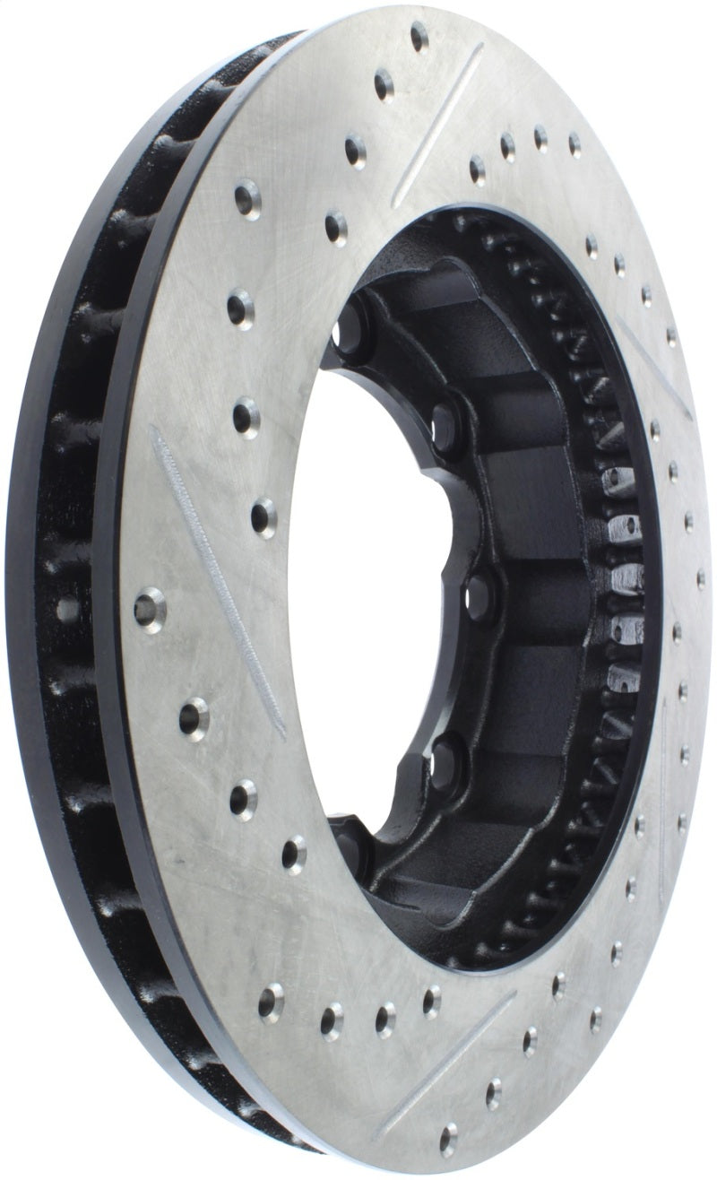StopTech Drilled and Slotted Sport Rotors are 1-piece direct replacement brake discs for factory brake systems and stock calipers that look great behind your wheels – and offer significantly improved braking performance. The unique cross-drilling and slotting aids with heat and brake dust dispersal, prevents glazing of the pads, adds bite and improves wet and dry braking performance. Built to last, the black e-coating provides protection from corrosion and the high carbon metallurgy (in most applications) offers quieter operation, better crack resistance and increased performance.