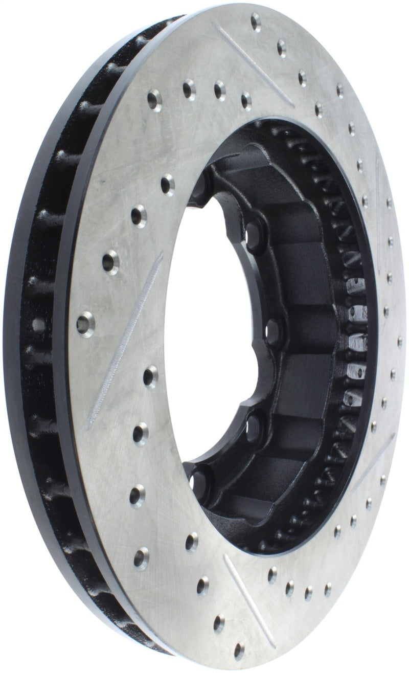 StopTech Drilled and Slotted Sport Rotors are 1-piece direct replacement brake discs for factory brake systems and stock calipers that look great behind your wheels – and offer significantly improved braking performance. The unique cross-drilling and slotting aids with heat and brake dust dispersal, prevents glazing of the pads, adds bite and improves wet and dry braking performance. Built to last, the black e-coating provides protection from corrosion and the high carbon metallurgy (in most applications) offers quieter operation, better crack resistance and increased performance.