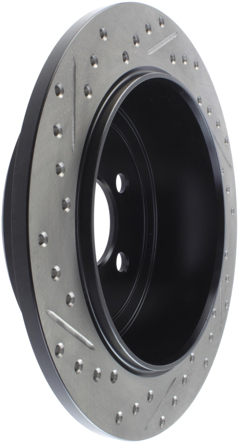 StopTech Drilled and Slotted Sport Rotors are 1-piece direct replacement brake discs for factory brake systems and stock calipers that look great behind your wheels – and offer significantly improved braking performance. The unique cross-drilling and slotting aids with heat and brake dust dispersal, prevents glazing of the pads, adds bite and improves wet and dry braking performance. Built to last, the black e-coating provides protection from corrosion and the high carbon metallurgy (in most applications) offers quieter operation, better crack resistance and increased performance.