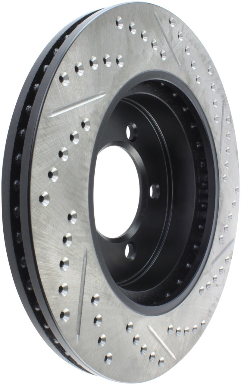 StopTech Drilled and Slotted Sport Rotors are 1-piece direct replacement brake discs for factory brake systems and stock calipers that look great behind your wheels – and offer significantly improved braking performance. The unique cross-drilling and slotting aids with heat and brake dust dispersal, prevents glazing of the pads, adds bite and improves wet and dry braking performance. Built to last, the black e-coating provides protection from corrosion and the high carbon metallurgy (in most applications) offers quieter operation, better crack resistance and increased performance.