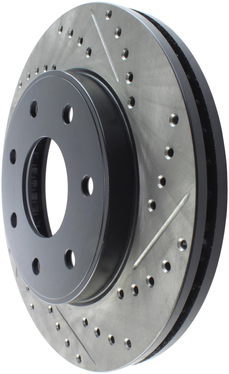 StopTech Drilled and Slotted Sport Rotors are 1-piece direct replacement brake discs for factory brake systems and stock calipers that look great behind your wheels – and offer significantly improved braking performance. The unique cross-drilling and slotting aids with heat and brake dust dispersal, prevents glazing of the pads, adds bite and improves wet and dry braking performance. Built to last, the black e-coating provides protection from corrosion and the high carbon metallurgy (in most applications) offers quieter operation, better crack resistance and increased performance.