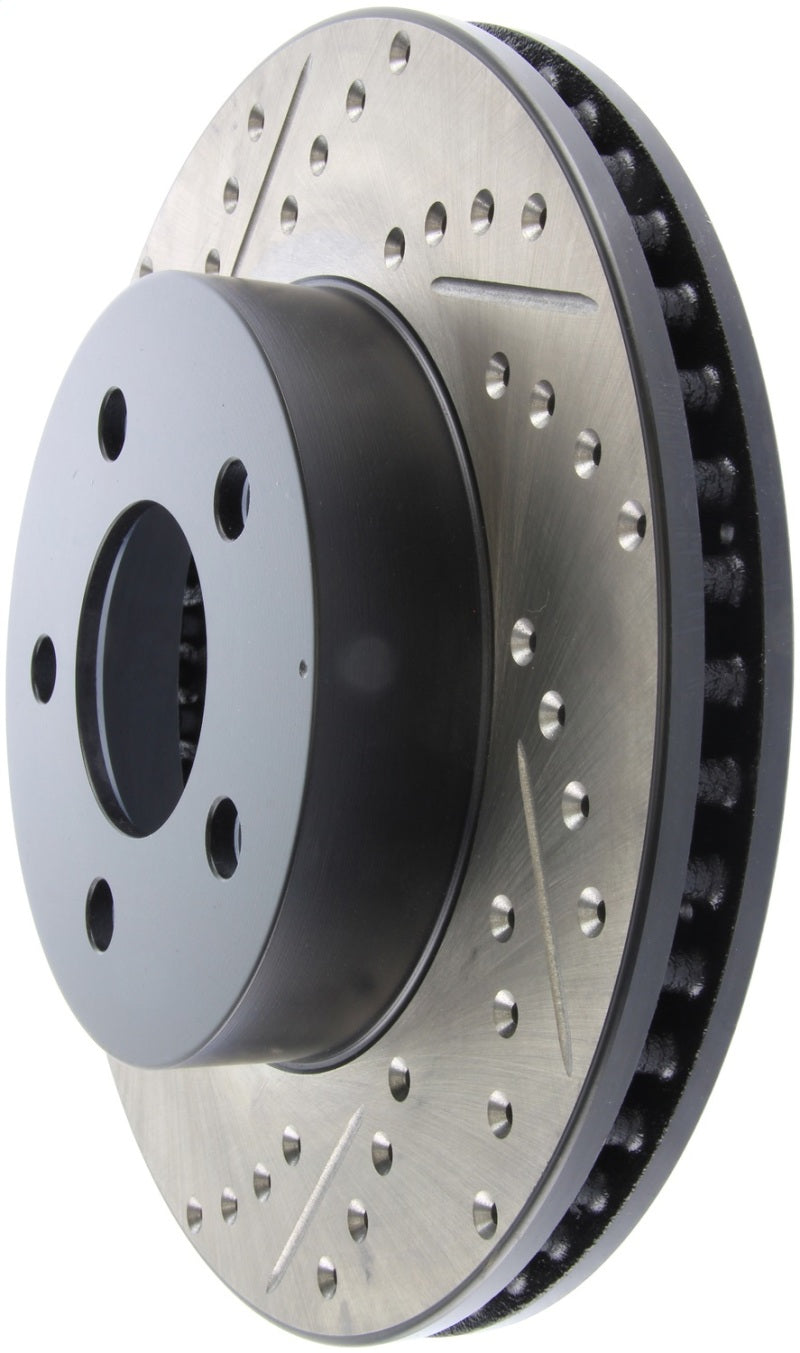 StopTech Drilled and Slotted Sport Rotors are 1-piece direct replacement brake discs for factory brake systems and stock calipers that look great behind your wheels – and offer significantly improved braking performance. The unique cross-drilling and slotting aids with heat and brake dust dispersal, prevents glazing of the pads, adds bite and improves wet and dry braking performance. Built to last, the black e-coating provides protection from corrosion and the high carbon metallurgy (in most applications) offers quieter operation, better crack resistance and increased performance.