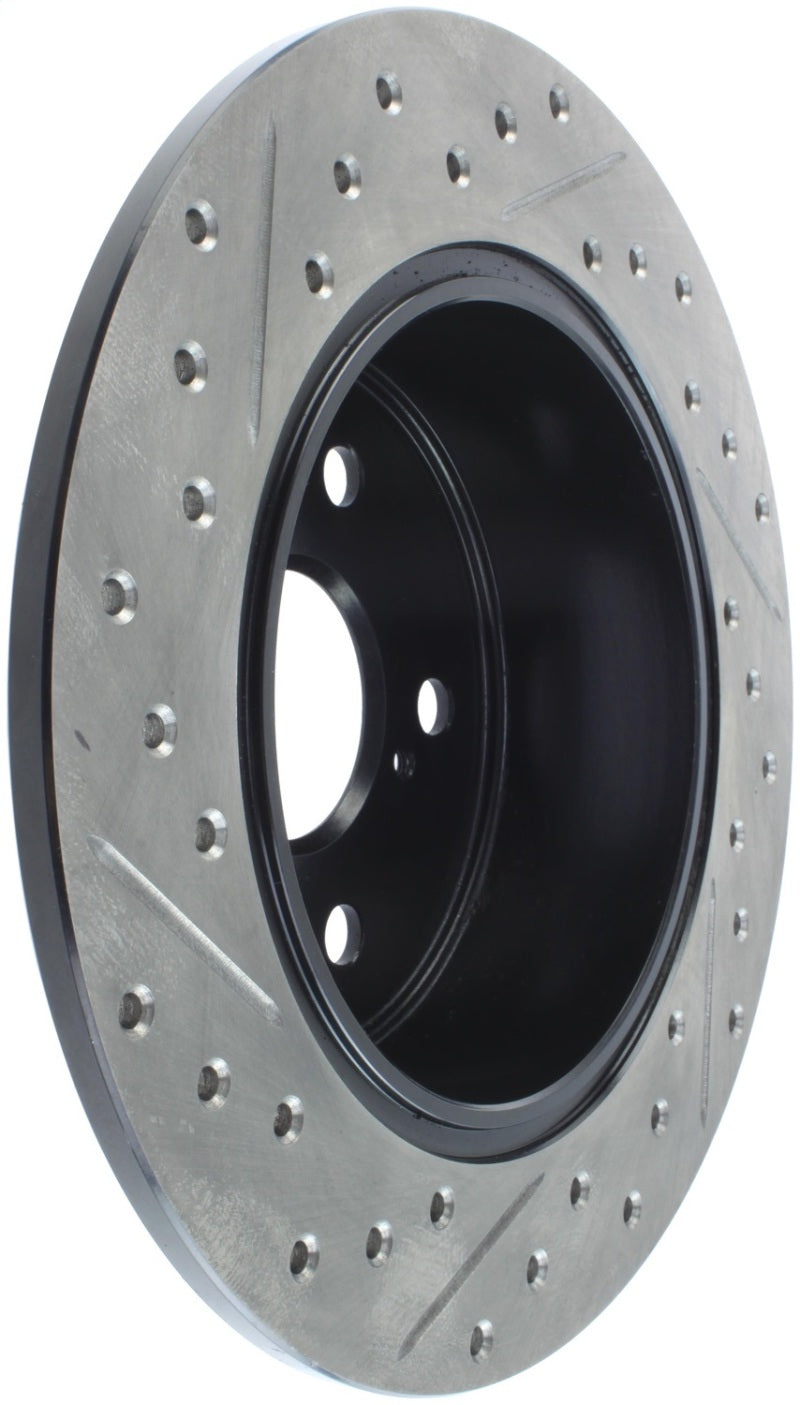 StopTech Drilled and Slotted Sport Rotors are 1-piece direct replacement brake discs for factory brake systems and stock calipers that look great behind your wheels – and offer significantly improved braking performance. The unique cross-drilling and slotting aids with heat and brake dust dispersal, prevents glazing of the pads, adds bite and improves wet and dry braking performance. Built to last, the black e-coating provides protection from corrosion and the high carbon metallurgy (in most applications) offers quieter operation, better crack resistance and increased performance.