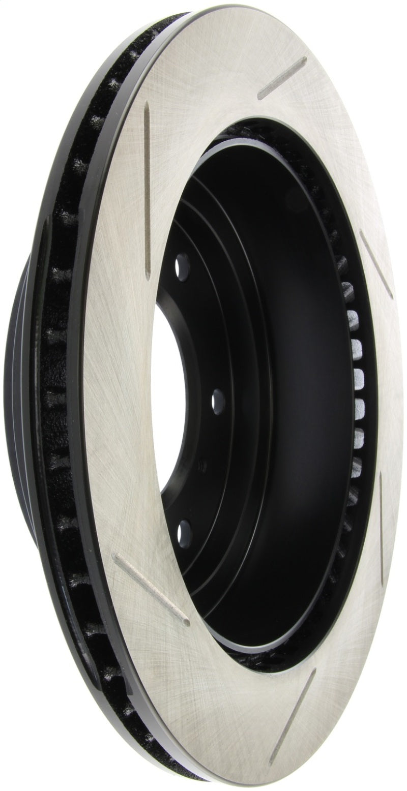 StopTech Slotted Sport Rotors are 1-piece direct replacement brake discs for factory brake systems and stock calipers that look great behind your wheels – and offer significantly improved braking performance. The unique slotting aids with heat and brake dust dispersal, prevents glazing of the pads, adds bite and improves wet and dry braking performance. Built to last, the black e-coating provides protection from corrosion and the high carbon metallurgy (in most applications) offers quieter operation, better crack resistance and increased performance.