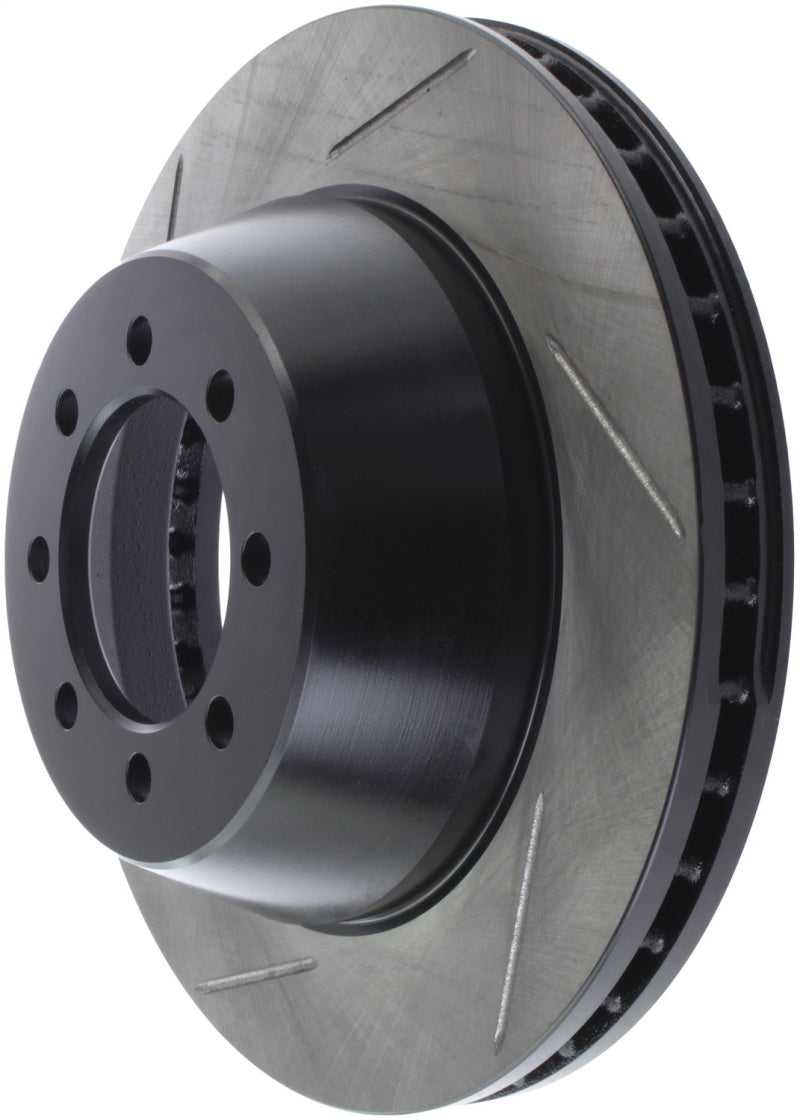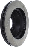 StopTech Slotted Sport Rotors are 1-piece direct replacement brake discs for factory brake systems and stock calipers that look great behind your wheels – and offer significantly improved braking performance. The unique slotting aids with heat and brake dust dispersal, prevents glazing of the pads, adds bite and improves wet and dry braking performance. Built to last, the black e-coating provides protection from corrosion and the high carbon metallurgy (in most applications) offers quieter operation, better crack resistance and increased performance.