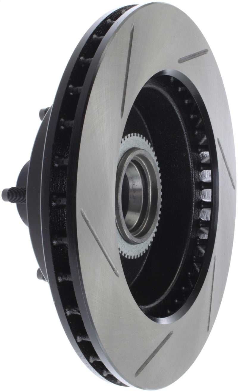 StopTech Slotted Sport Rotors are 1-piece direct replacement brake discs for factory brake systems and stock calipers that look great behind your wheels – and offer significantly improved braking performance. The unique slotting aids with heat and brake dust dispersal, prevents glazing of the pads, adds bite and improves wet and dry braking performance. Built to last, the black e-coating provides protection from corrosion and the high carbon metallurgy (in most applications) offers quieter operation, better crack resistance and increased performance.
